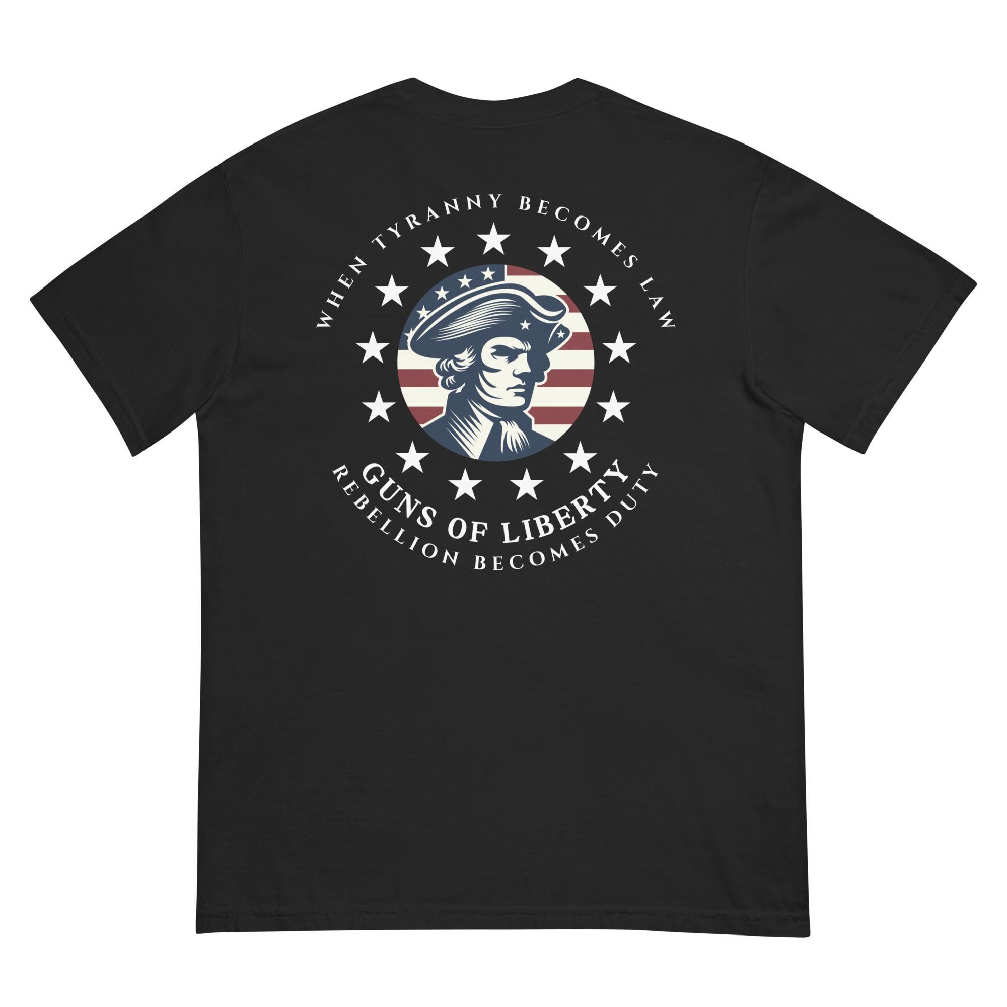 Ring-spun cotton, dyed deep like the resolve of free men. This isn’t fashion — it’s armor for the culture war. Front carries the unapologetic truth: Chains are for the willing. The rest of us load magazines and remember 1776. The back features a large, bold Guns of Liberty logo that lets everyone know exactly where you stand.